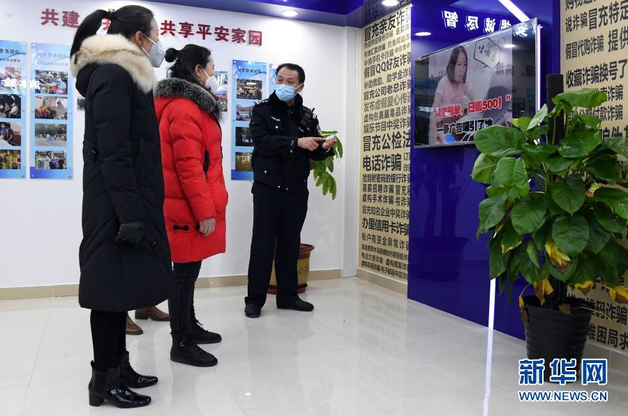 1月10日,在北京市公安局海淀分局永定路派出所第三社区警务工作站展示区,社区民警屈超直(右一)向社区居民介绍防诈骗知识。