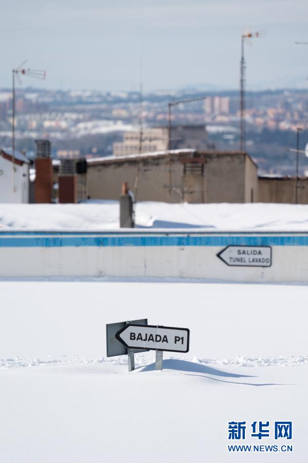 这是1月10日在西班牙马德里一处停车场拍摄的深埋在雪中的路标。新华社记者 孟鼎博 摄