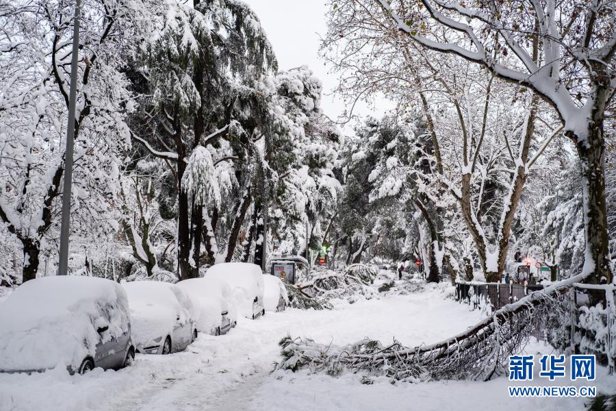 1月10日,在西班牙马德里市中心,被雪压断的树枝砸在路边停放的车辆上。 西班牙内政大臣马拉斯卡10日说,风暴“菲洛梅娜”带来的暴雪和寒冷天气造成西班牙4人死亡。在受影响最为严重的中部和东部,部分地区积雪厚度接近50厘米;许多树木被积雪压倒,一些道路被阻断;大量运输车滞留在公路上。西班牙交通大臣阿瓦洛斯表示,9日交通陷入瘫痪的马德里已于10日恢复部分长途铁路运输服务。 新华社记者 孟鼎博 摄