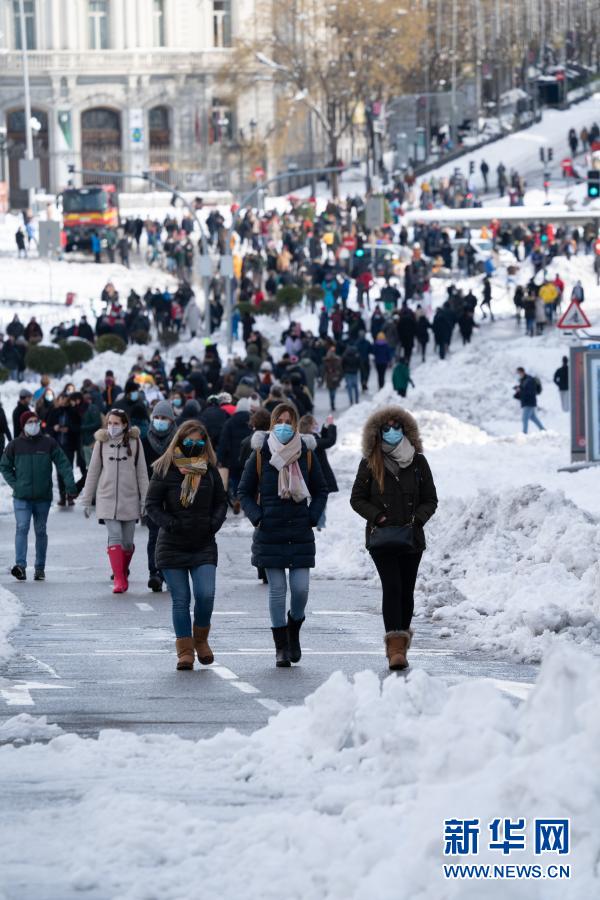 1月10日,人们走在雪后的西班牙马德里街头。新华社记者 孟鼎博 摄 |