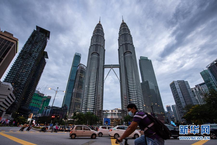 1月12日,在马来西亚吉隆坡的马来西亚国家石油公司双塔前,一名骑车男子戴着口罩等待红绿灯。