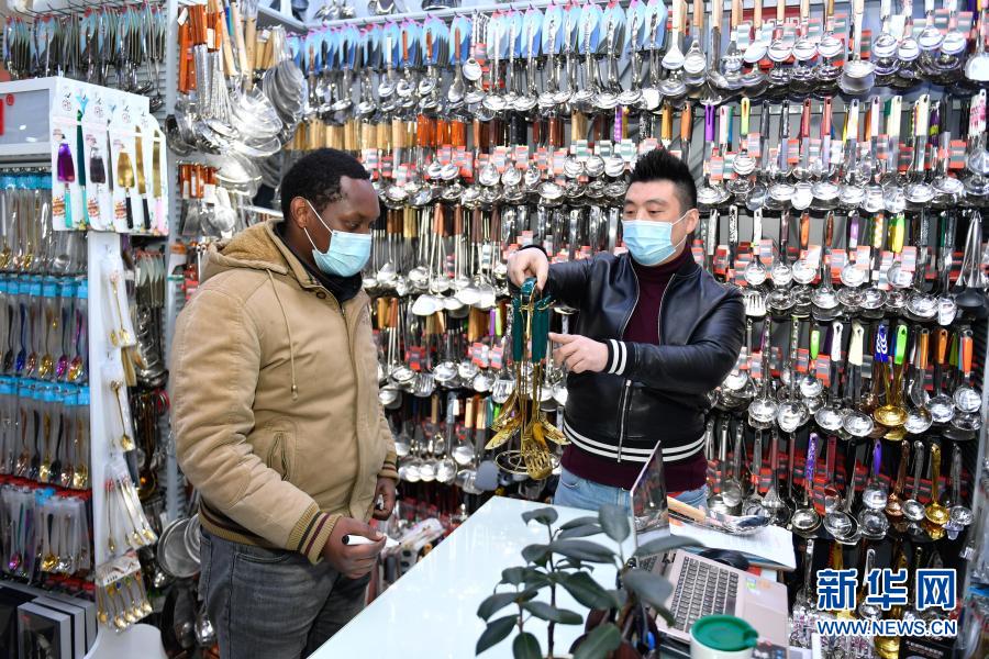1月14日,肯尼亚客商在义乌国际商贸城选购厨具。新华社记者 黄宗治 摄