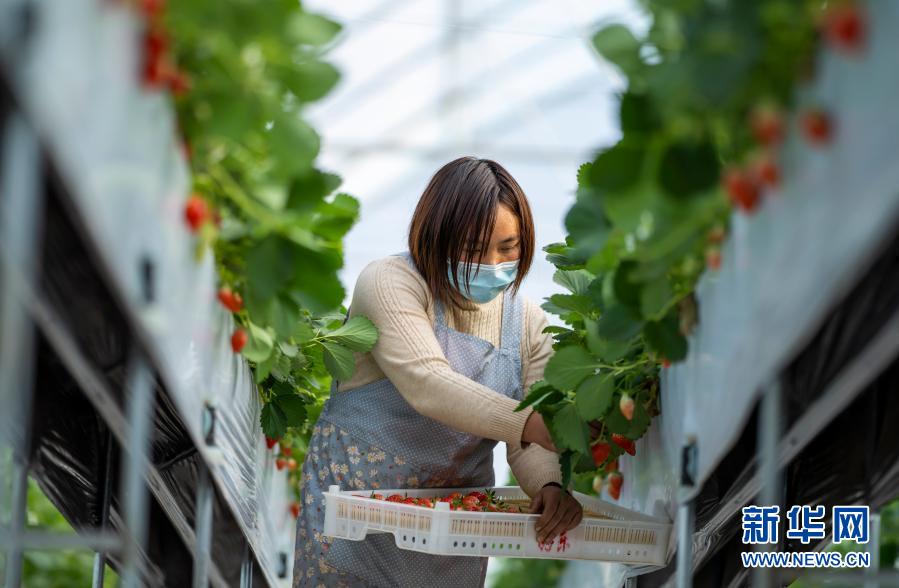 云南省会泽县待补镇村民在采摘草莓(1月15日摄)。