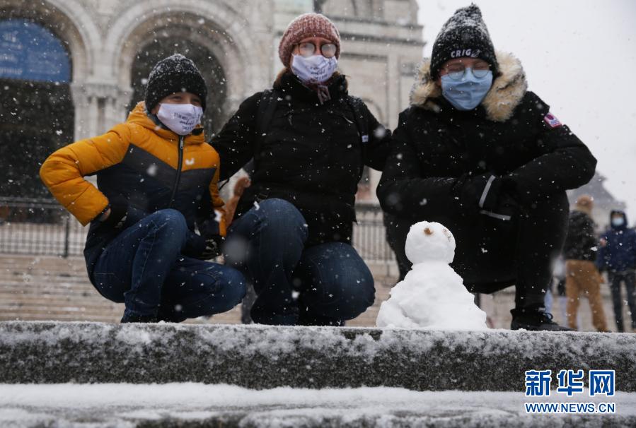 1月16日,人们在法国巴黎蒙马特高地圣心教堂前与小雪人合影。 当日,法国巴黎迎来今冬以来的首场降雪。 新华社记者高静摄