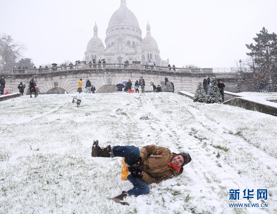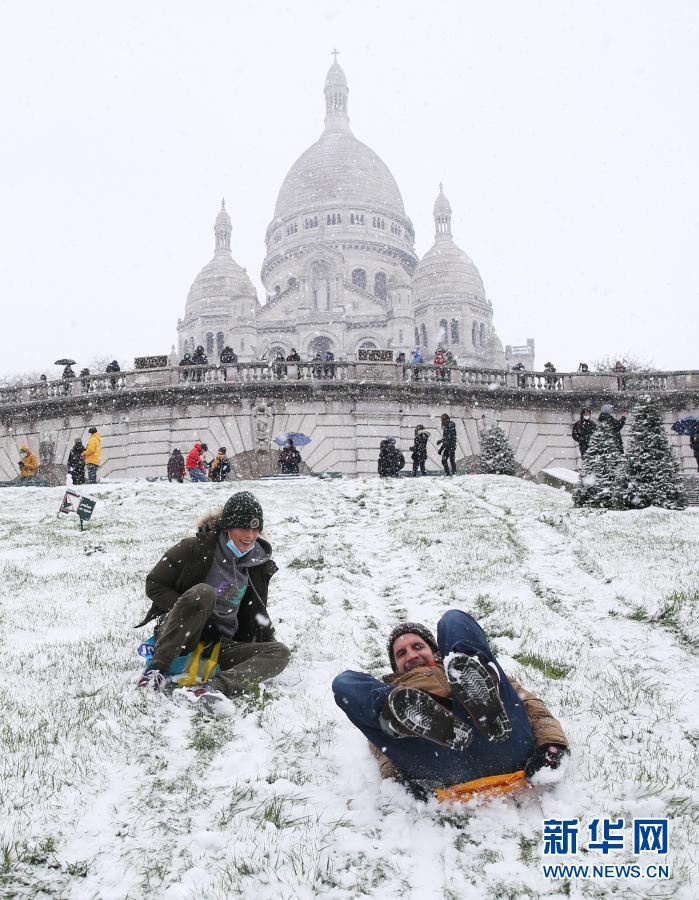 1月16日,人们在法国巴黎蒙马特高地圣心教堂前“滑雪”。 当日,法国巴黎迎来今冬以来的首场降雪。 新华社记者高静摄
