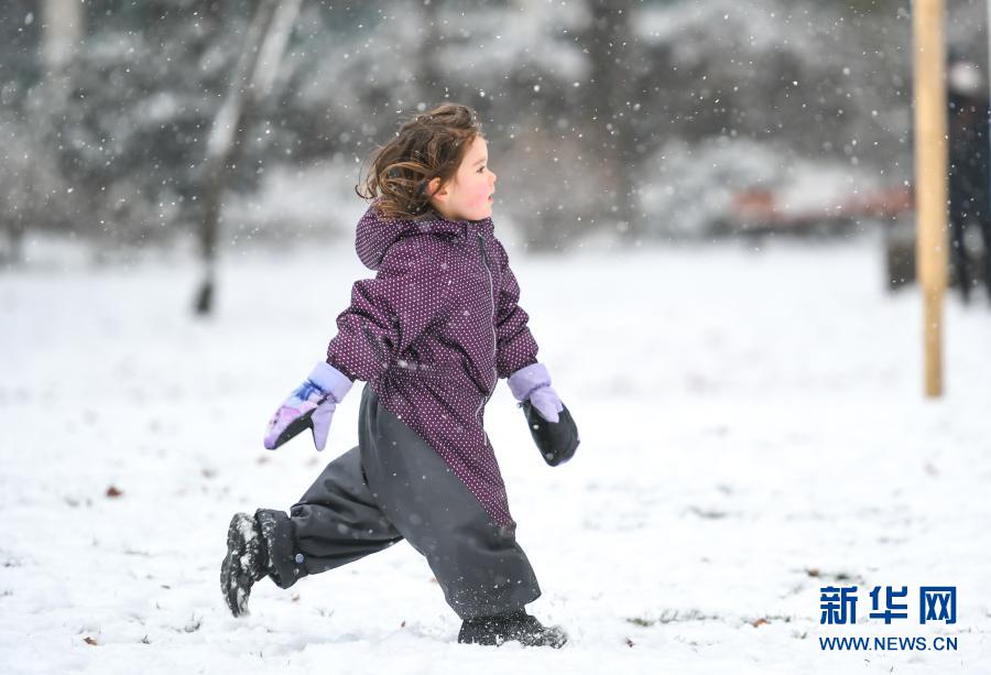 当日,德国法兰克福市降雪。不少家长带着孩子来到户外,尽享雪趣。
