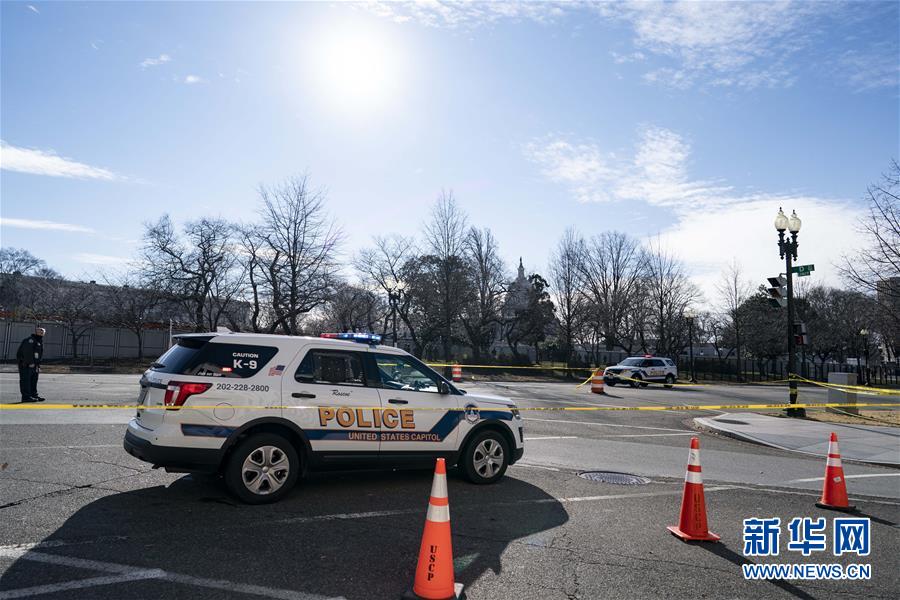 1月18日,在美国首都华盛顿,警车停靠在国会大厦附近待命。新华社记者 刘杰 摄