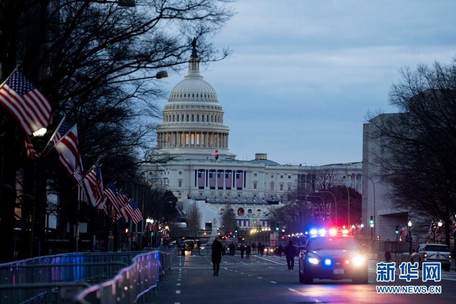 1月17日傍晚,在美国华盛顿,用于举行就职典礼的国会大厦及周边区域被隔离围栏封锁。 美国当选总统拜登就职典礼将于1月20日在首都华盛顿举行。连日来,华盛顿中心地带的安保措施日趋严密。 新华社记者 刘杰 摄