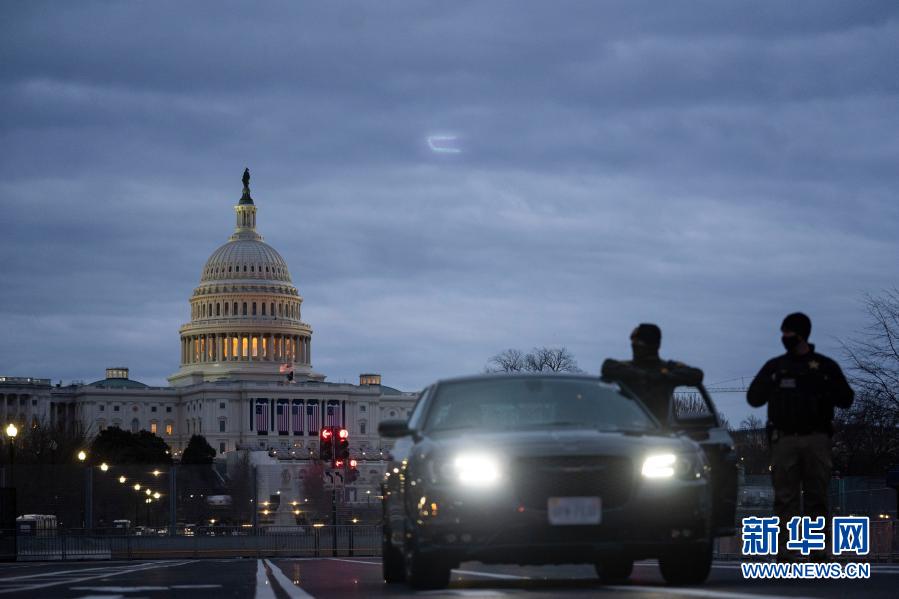 1月17日傍晚,在美国华盛顿,安保人员在国会大厦附近警戒。新华社记者 刘杰 摄