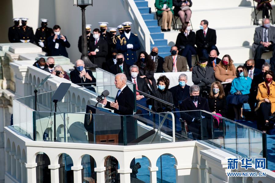 1月20日,在美国首都华盛顿国会山,拜登在美国第46任总统就职典礼上发表讲话。新华社记者 刘杰 摄 新华社华盛顿1月20日电(记者徐剑梅 邓仙来)美国当选总统、民主党人拜登20日在美国首都华盛顿国会山举行的就职典礼上宣誓就任美国第46任总统。 在国会山举行的就职典礼上,78岁的拜登在联邦最高法院首席法官罗伯茨带领下完成宣誓。他随后发表约20分钟的就职演讲,称美国当前面临着新冠疫情肆虐、社会不平等加剧、系统性种族主义问题、气候变化等一系列危机与挑战。拜登呼吁国家团结,同时表示将打击政治极端主义、白人至上主义和国内恐怖主义。 美国当选副总统哈里斯当天也宣誓就职,成为美国历史上首位女性副总统。