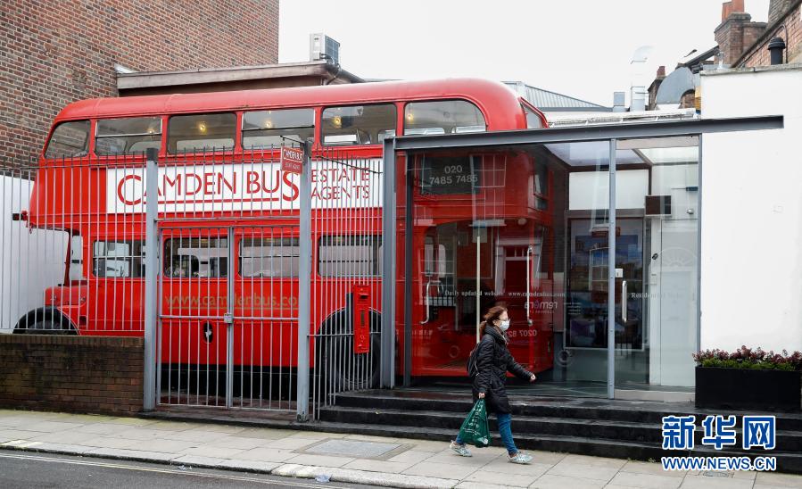 1月19日,一名戴口罩的女子从英国伦敦一家装饰成红色双层巴士的房产中介公司前走过。