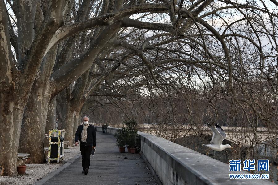 1月19日,在意大利首都罗马,一名男子戴着口罩走在台伯河边。