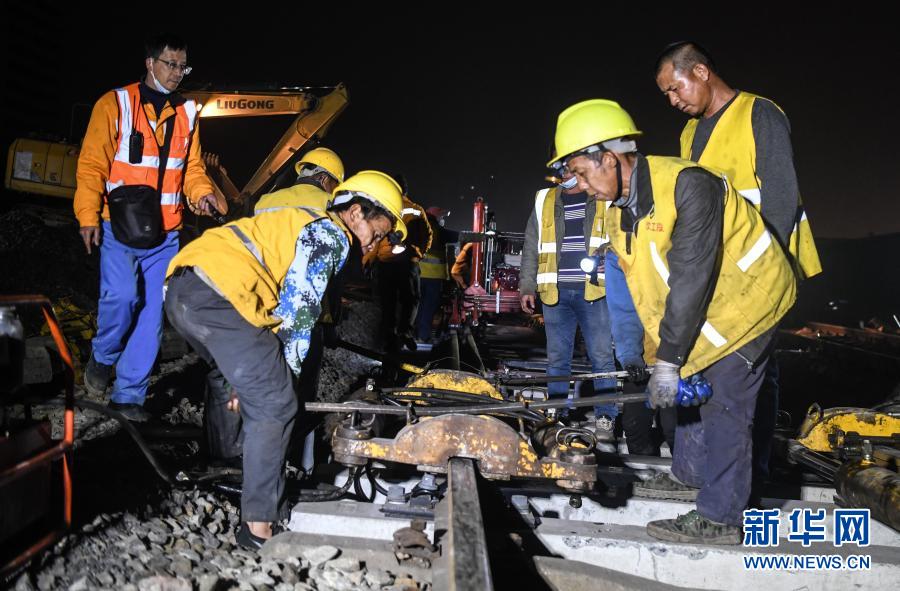 1月21日凌晨,在防城港第三进港线建设现场,铁路工人在作业中。 连日来,中国铁路南宁局集团有限公司钦州工务段的铁路工人们全力备战春运,白天集中力量全面“体检”线路,确保“带病设备”及时下道;夜晚加紧驳接道岔,推进防城港第三进港线建设,为2021年春运保驾护航。 新华社记者 张爱林 摄