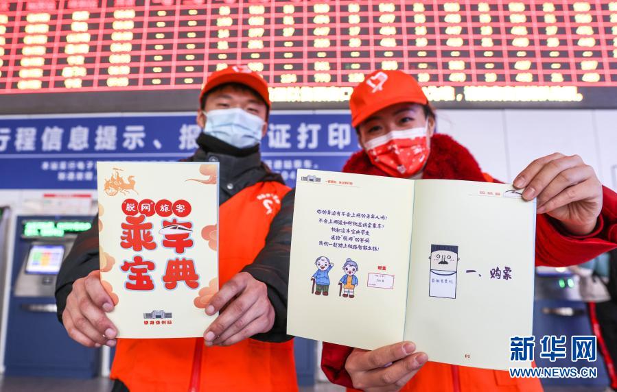 1月21日,徐州东站的“小甜橙”志愿者展示“乘车宝典”。 近日,中国铁路上海局集团有限公司徐州直属站为服务不会上网订票的旅客设计制作了“乘车宝典”漫画小册子,方便“脱网”旅客按照画册上的步骤自助购票乘车。 新华社记者 杨磊 摄 |