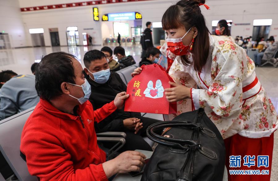 当日,中国铁路上海局集团有限公司徐州直属站徐州东站的“顺心”雷锋服务台的客运工作人员身着“汉服”,为候车的旅客宣传防疫知识,并为部分旅客送上装有宣传卡、口罩等防疫物品的自制福袋。
