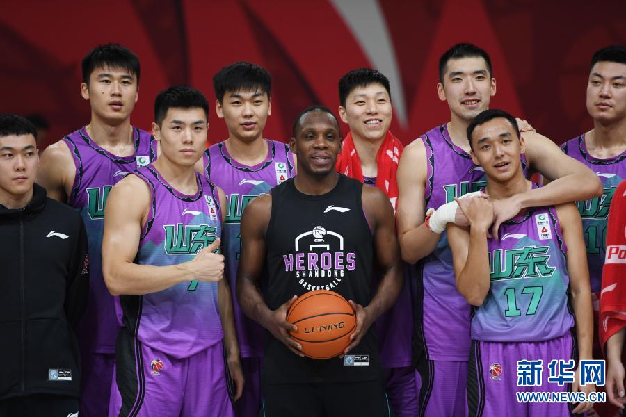 1月20日,山东西王队球员哈德森(中)赛后与队友合影。