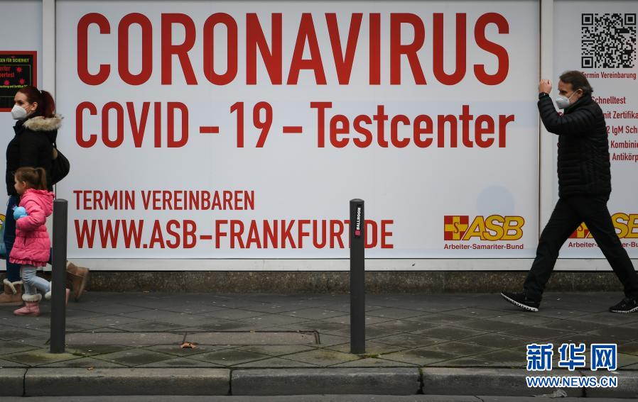 1月20日,在德国法兰克福,戴口罩的行人从一处新冠病毒检测中心外经过。