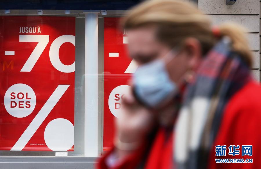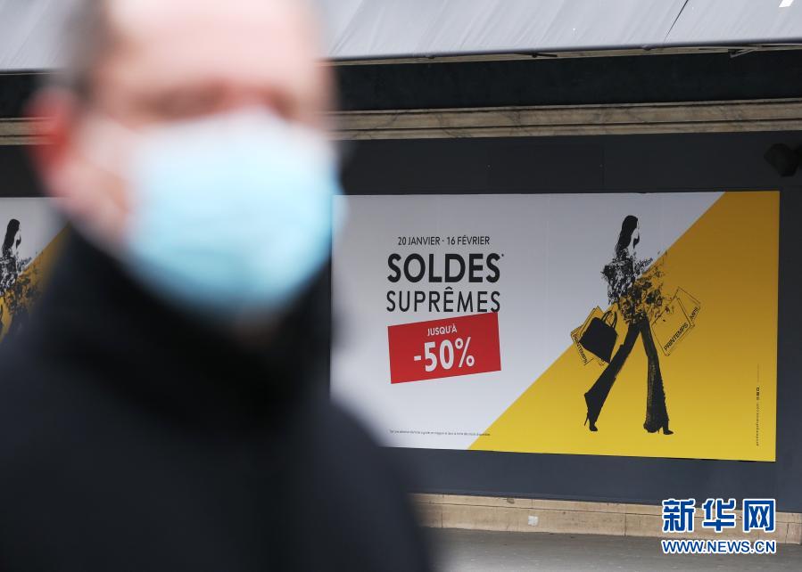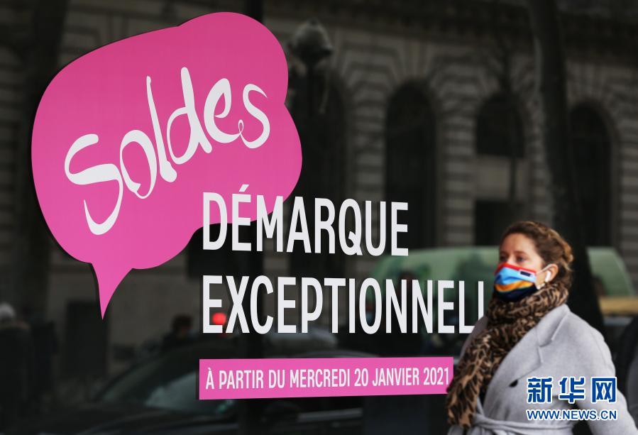 1月20日,一名女子走过法国巴黎街头的打折季广告。 受新冠疫情影响,法国原本定于1月8日开始的2021冬季打折季推迟至20日开始,为期四周。 新华社记者 高静 摄