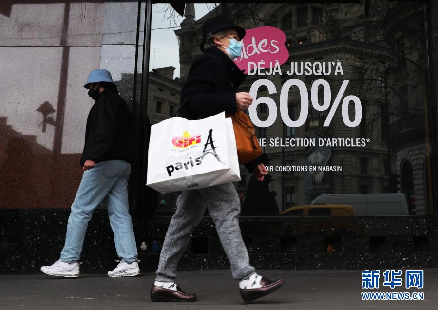1月20日,人们走过法国巴黎街头的打折季广告。新华社记者 高静 摄