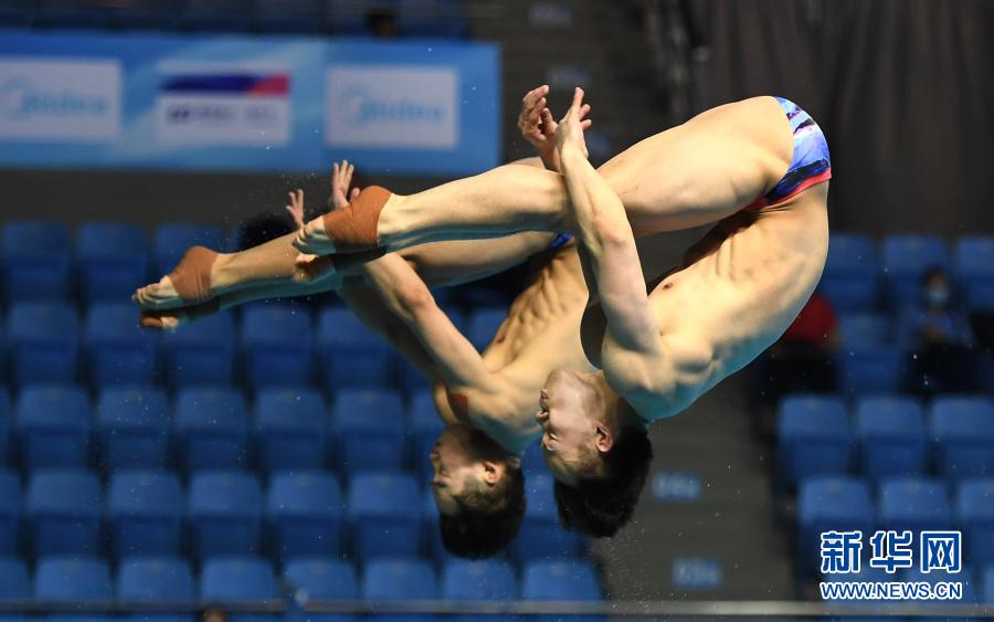 1月21日,广东海印队选手谢思埸(右)/湖北浩沙队选手王宗源在男子双人3米跳板决赛中。最终,他们以504.24分的成绩获得冠军。