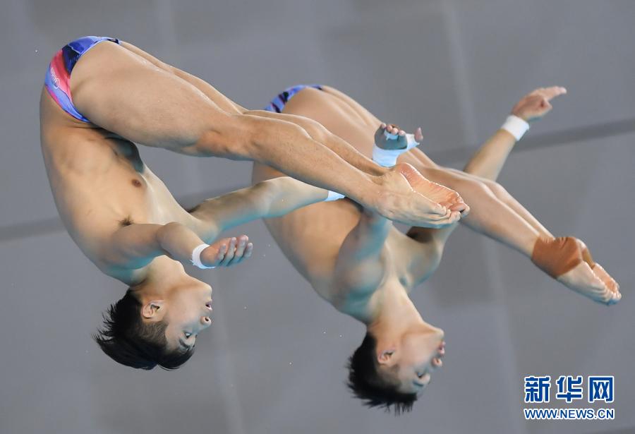 1月21日,广东海印队选手陈艾森/北京水立方队选手曹缘(左)在男子双人10米跳台决赛中。最终,他们以482.73分的成绩获得冠军。