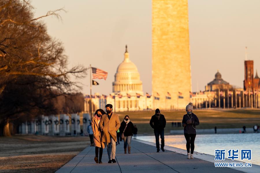 1月23日,佩戴口罩的游客在美国华盛顿林肯纪念堂倒影池游览。