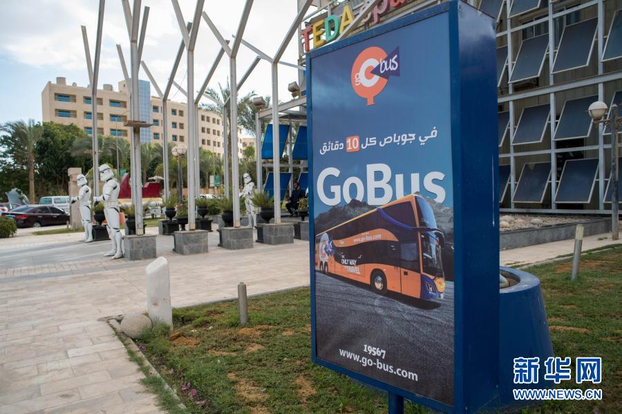 这是1月14日在埃及苏赫奈泉拍摄的中埃·泰达苏伊士经贸合作区内的“Go Bus”通勤系统标志牌。新华社记者 邬惠我 摄