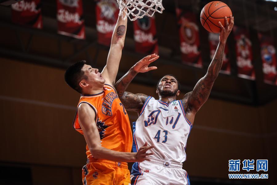 1月25日,四川五粮金樽队球员亨特(右)在比赛中上篮。