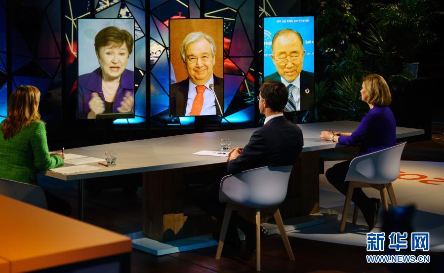 这是1月25日在荷兰海牙拍摄的联合国秘书长古特雷斯(中)等通过视频连线出席首届气候适应峰会。 首届气候适应峰会25日开幕。在两天会议期间,来自全球多个国家和国际组织的代表将回顾在应对极端天气和自然灾害方面所取得的进展,探讨如何进一步改善应对方法,并为今年11月召开的《联合国气候变化框架公约》第26次缔约方大会描绘路线图。