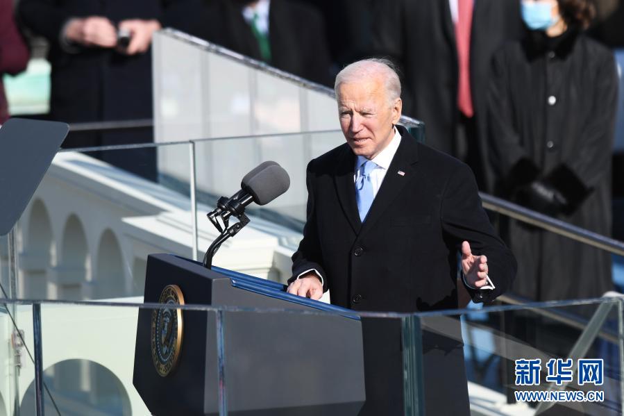 1月20日,在美国首都华盛顿国会山,拜登在美国第46任总统就职典礼上发表讲话。新华社记者 刘杰 摄