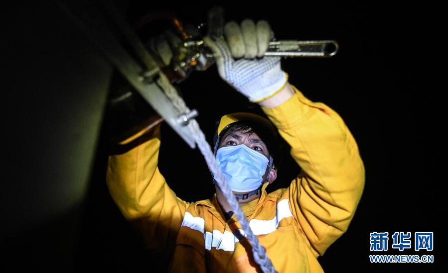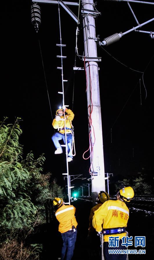 接触网工白家政攀爬蜈蚣梯上接触网检修线路(1月25日摄)。 连日来,中国铁路南宁局集团有限公司南宁供电段的工人们利用子夜“天窗”时间,全面检修南广高铁、普铁接触网部件,排除各种隐患,为2021年的春运保驾护航。 新华社记者张爱林摄