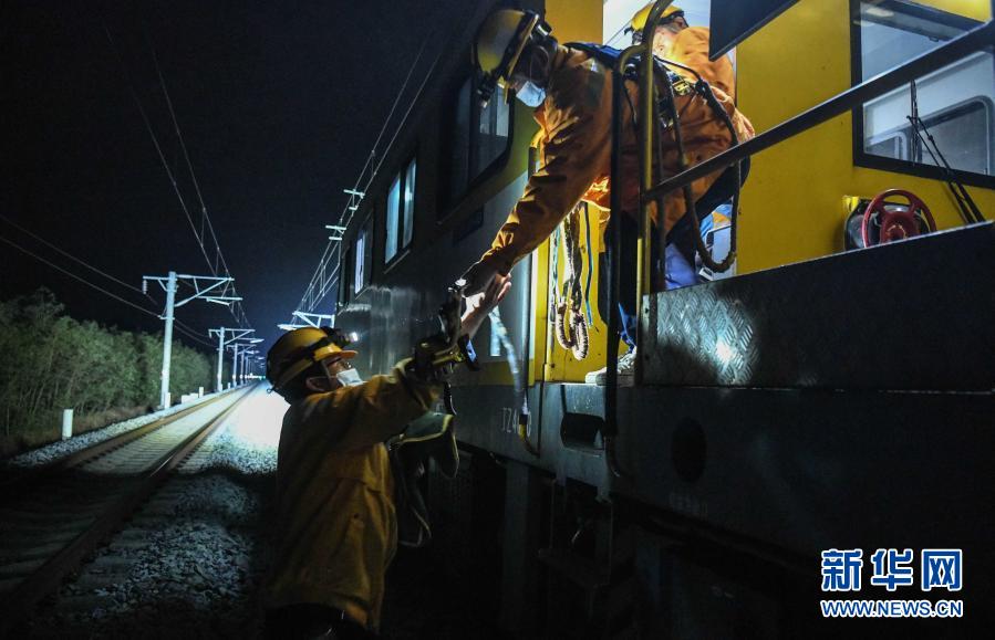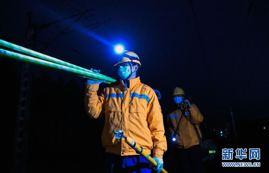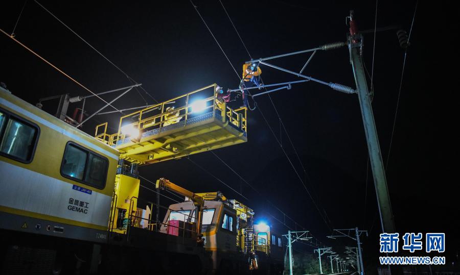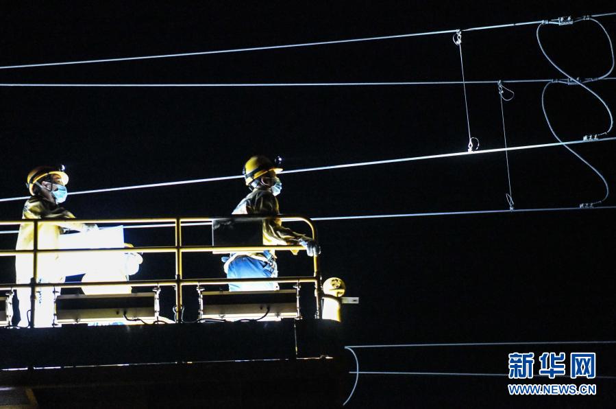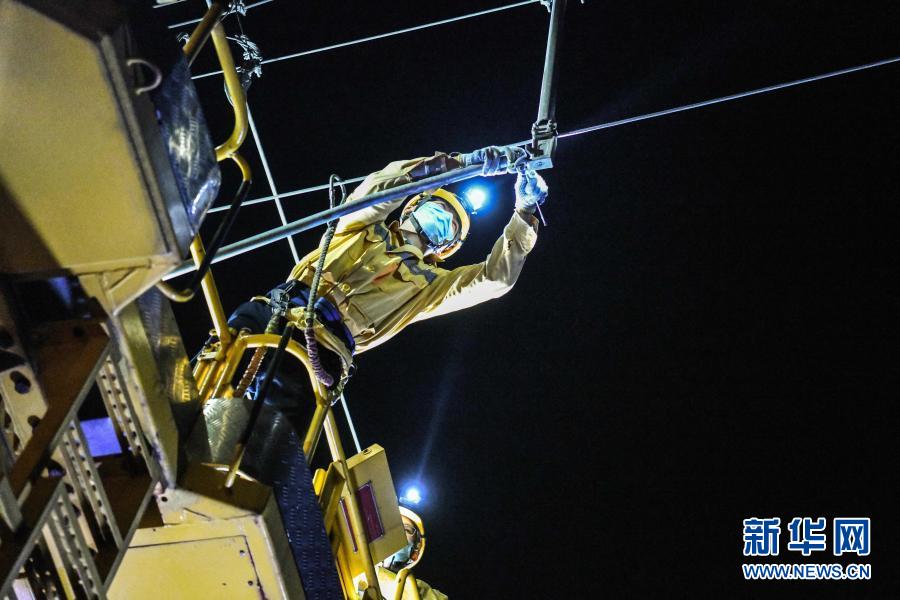 1月25日凌晨,接触网工在南广高铁宾阳至贵港区段检修线路。 连日来,中国铁路南宁局集团有限公司南宁供电段的工人们利用子夜“天窗”时间,全面检修南广高铁、普铁接触网部件,排除各种隐患,为2021年的春运保驾护航。 新华社记者张爱林摄