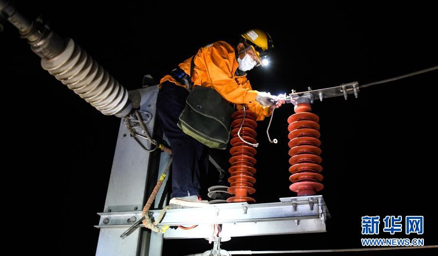 1月25日凌晨,接触网工蒋鹏(上)和作业负责人宁耀剑配合安装避雷器计数器引线。 连日来,中国铁路南宁局集团有限公司南宁供电段的工人们利用子夜“天窗”时间,全面检修南广高铁、普铁接触网部件,排除各种隐患,为2021年的春运保驾护航。 新华社记者张爱林摄