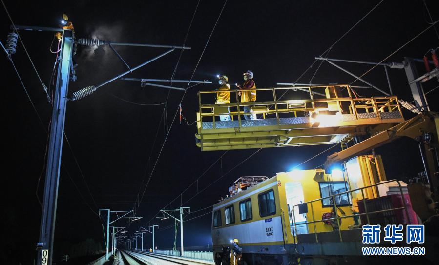 这是接触网工在检修南广普铁线路(1月26日摄)。 连日来,中国铁路南宁局集团有限公司南宁供电段的工人们利用子夜“天窗”时间,全面检修南广高铁、普铁接触网部件,排除各种隐患,为2021年的春运保驾护航。 新华社记者张爱林摄