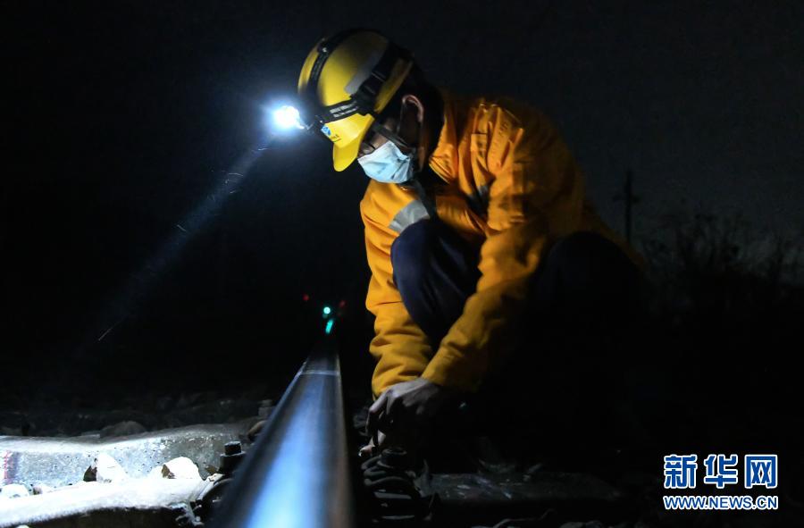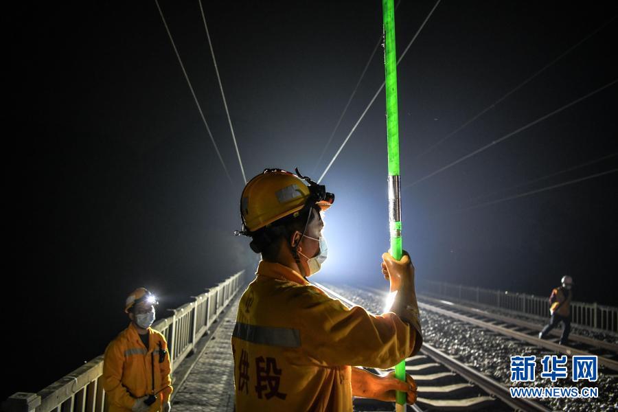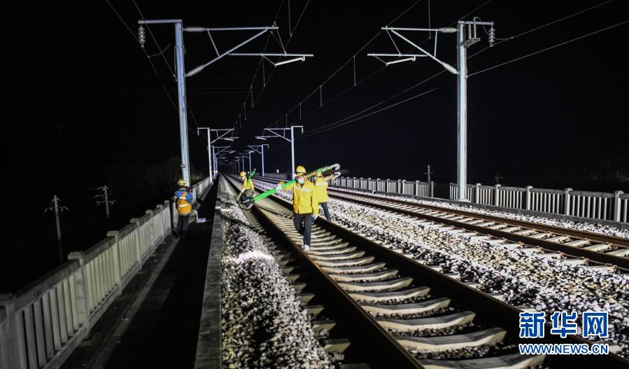 在南广铁路覃塘至黎塘段,接触网工们巡回检查接触网,排除安全隐患(1月26日摄)。 连日来,中国铁路南宁局集团有限公司南宁供电段的工人们利用子夜“天窗”时间,全面检修南广高铁、普铁接触网部件,排除各种隐患,为2021年的春运保驾护航。 新华社记者张爱林摄