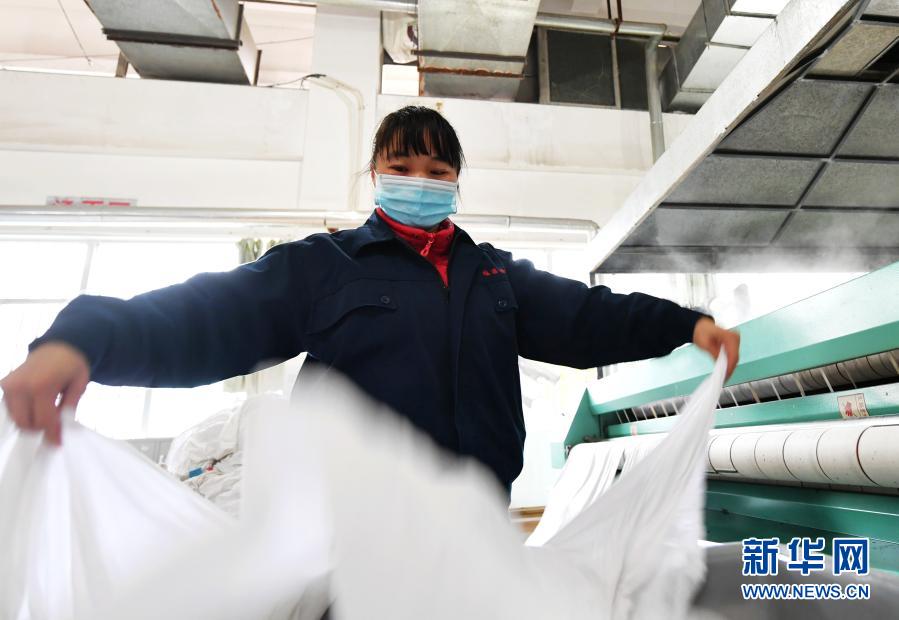 1月27日,在福州客运段卧具洗涤厂,工作人员把被单放进烘干机进行高温烘干。