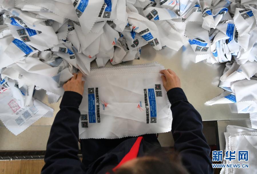 1月27日,在福州客运段卧具洗涤厂,工作人员整理消毒过的动车组椅背垫。