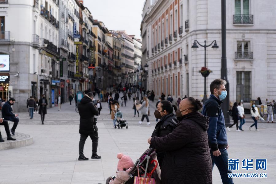 1月26日,人们戴口罩走过西班牙马德里太阳门广场。