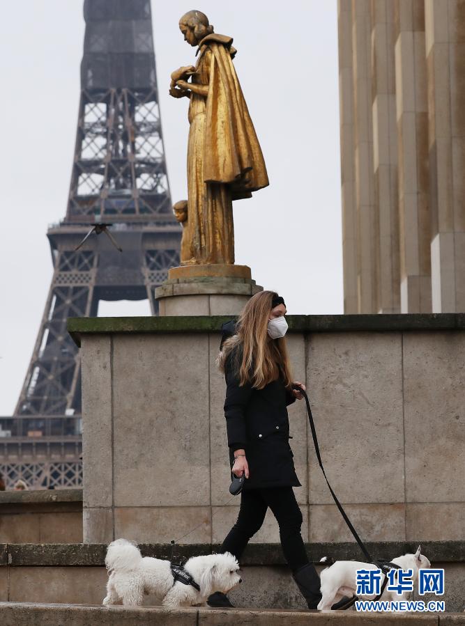 1月27日,一名女子在法国巴黎埃菲尔铁塔附近的特罗卡德罗广场遛狗。