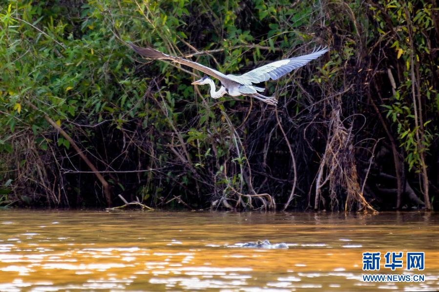 在南美洲中部潘塔纳尔湿地,鹭鸟飞过潜伏于水中的鳄鱼(2015年12月5日摄)。