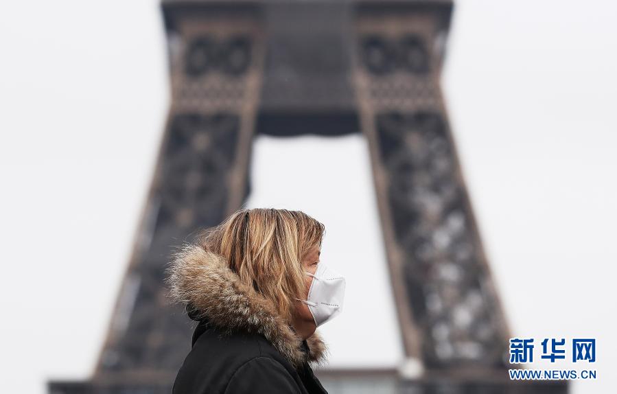 1月27日,一名女士走过法国巴黎埃菲尔铁塔附近的特罗卡德罗广场。 法国近三周来陆续出现感染变异新冠病毒病例,一些专家呼吁第三次“封城”。 新华社记者 高静 摄