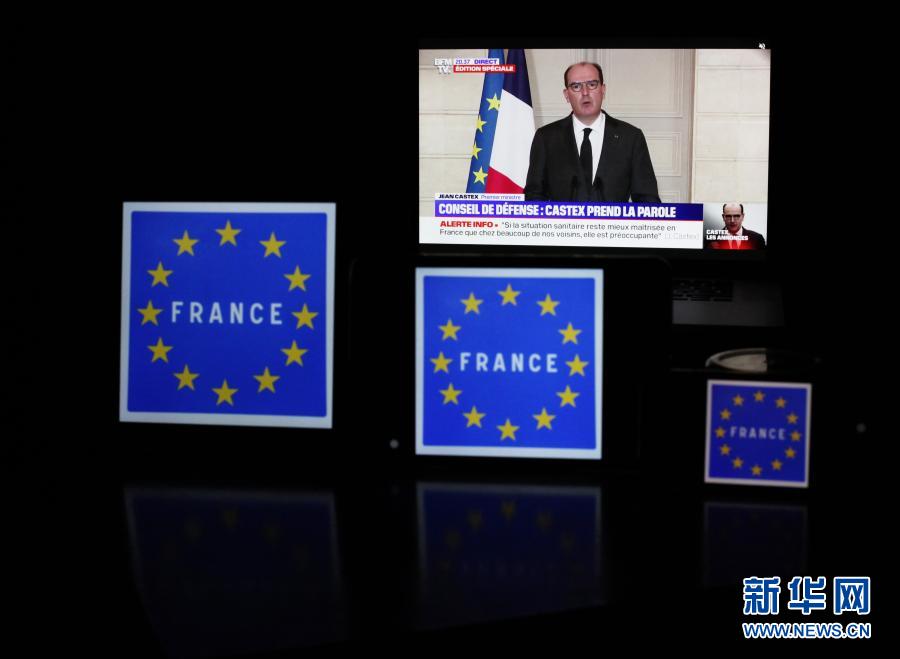 这是1月30日在法国巴黎拍摄的法国总理卡斯泰的新闻发布会视频画面以及法国边界标志牌的照片。 法国总理卡斯泰29日晚宣布,为遏制新冠疫情,法国政府决定对欧盟以外国家关闭边界。 新华社记者 高静 摄