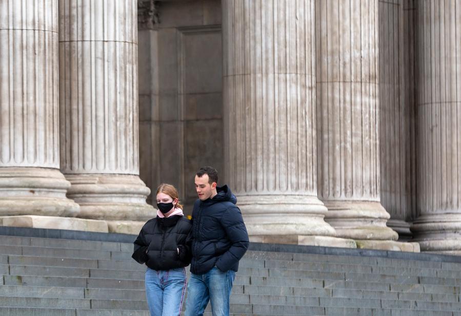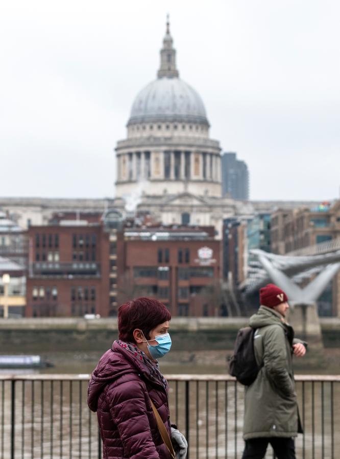 2月1日,人们戴着口罩走在英国伦敦泰晤士河畔。 英国政府2月1日发布的数据显示,截至1月31日,该国已有9296367人接种第一剂新冠疫苗,其中494209人接种了第二剂疫苗。 新华社记者 韩岩 摄