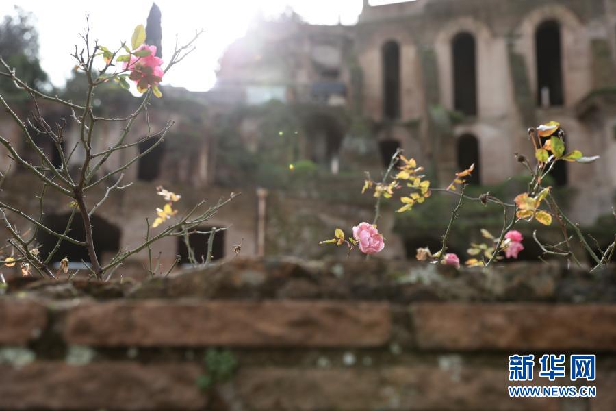 这是2月1日在意大利首都罗马重新开放的古罗马广场内拍摄的鲜花。 意大利大部分地区从2月1日开始降入最低风险级别的“黄区”,放松疫情管控措施。 新华社记者 程婷婷 摄