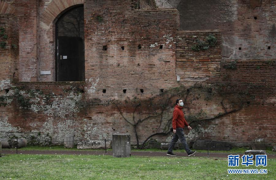 2月1日,在意大利首都罗马,一名戴着口罩的男子在重新开放的古罗马广场内游览。 意大利大部分地区从2月1日开始降入最低风险级别的“黄区”,放松疫情管控措施。 新华社记者 程婷婷 摄