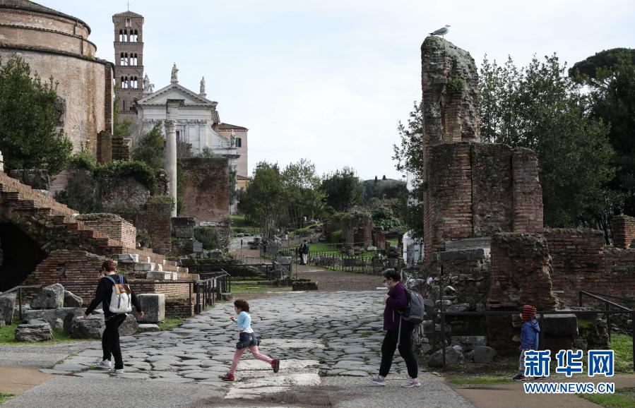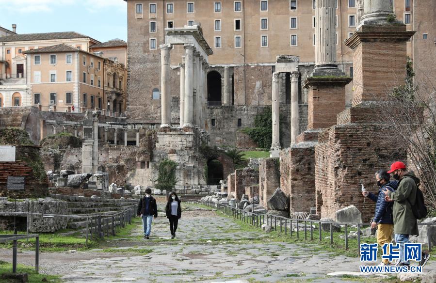 2月1日,在意大利首都罗马,人们在重新开放的古罗马广场内游览。 意大利大部分地区从2月1日开始降入最低风险级别的“黄区”,放松疫情管控措施。 新华社记者 程婷婷 摄