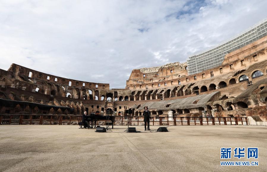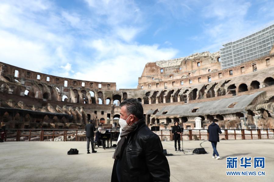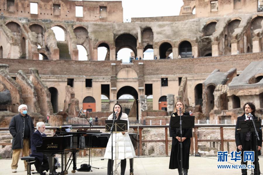 2月1日,在意大利首都罗马,音乐家在重新开放的斗兽场内表演。 意大利大部分地区从2月1日开始降入最低风险级别的“黄区”,放松疫情管控措施。 新华社记者 程婷婷 摄