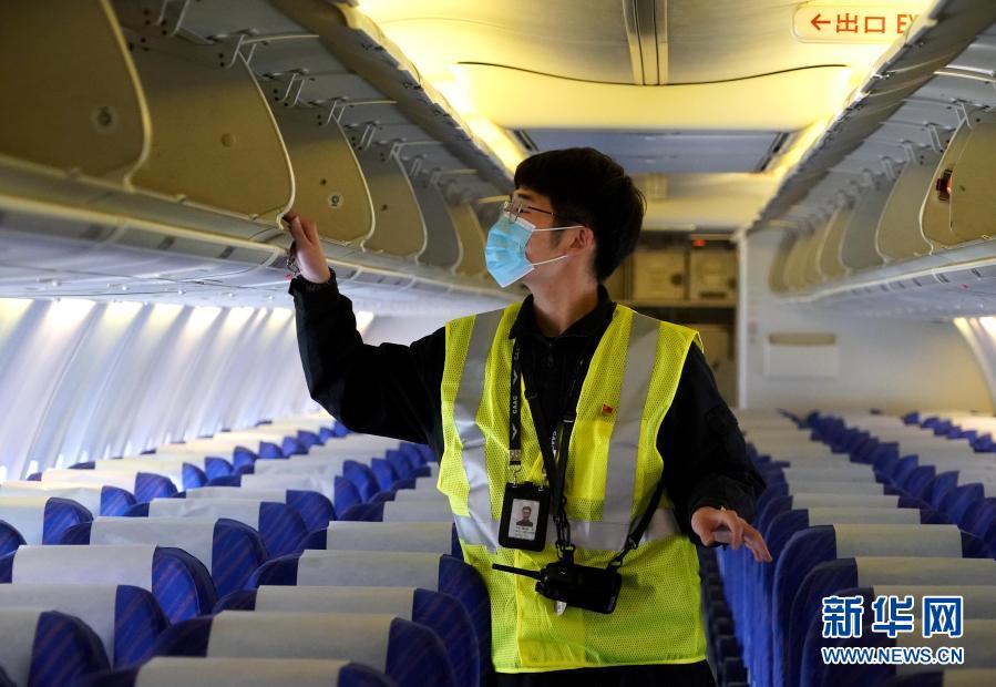 2月3日,南航河南公司机务工程师魏文楷在客舱检查行李架,完成飞机清舱工作。新华社记者 李安 摄