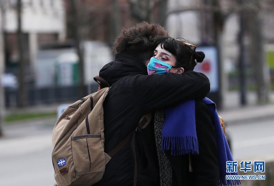 2月3日,一对情侣在法国巴黎街头拥抱。新华社记者 高静 摄