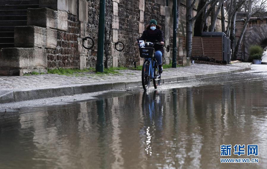 2月3日,一名女子骑车经过法国巴黎塞纳河畔被水淹没的地区。